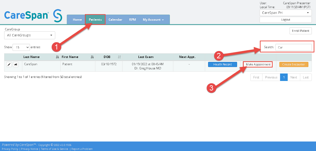 To book an appointment, from your Dashboard, click the Patient Tab. You can search the first 3 letters of the name of the patient and then click Make Appointment to set a consultation for the patient