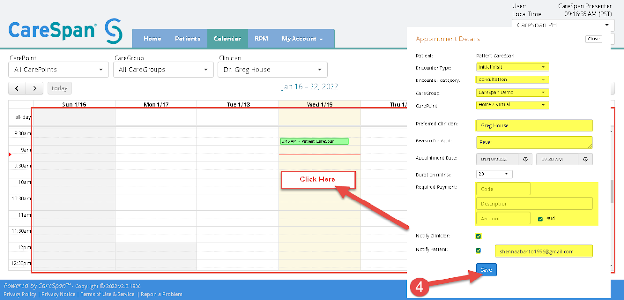 You will be directed to the calendar Tab, select the preferred Date and Time for the advanced appointment by clicking on any part of calendar area. A pop- up window will appear, enter all the required appointment details; Encounter type, Encounter Category, CareGroup,CarePoint, Preferred Clinician, Reason for Appointment, Appointment date and Time, Duration and the Payment method, once entered don't forget to click on notify clinician and notify patient so that the platform will send an email notification for the scheduled appointment. Lastly, click on Save to submit.