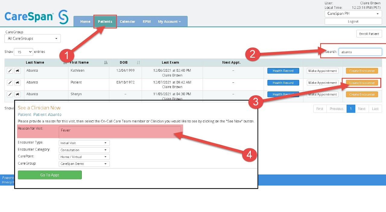 To create a reason for Encounter, just go to the Patient tab then search for the name of the patient then click on Create an Encounter. And enter the reason for visit.